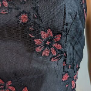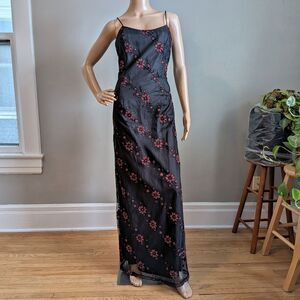 Vintage 1990s Morgan and Co by Linda Bernell black floral maxi dress. Red glitter floral details. Sleeveless, spaghetti straps. Scoop/low back. Zip up back with slit. Lined. Dress is in good vintage condition with light wear.