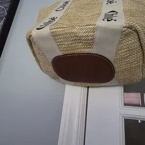 straw tote bag featuring leather accents. Stylish and versatile.