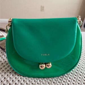 Elegant Furla bag in a striking emerald green. Features a sleek design with gold accents.