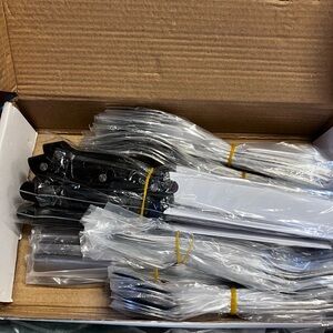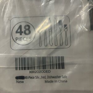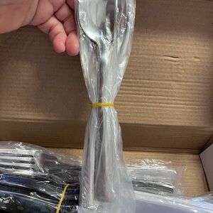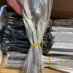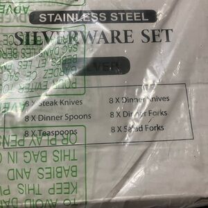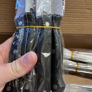 Elegant cutlery set with stainless steel and black handle knives. Includes forks, spoons, and knives. Perfect for any dining occasion.