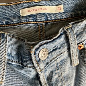 Stylish Levi's straight leg jeans. Light blue color. Ankle length.