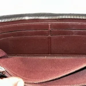 This wallet shows some wear on its edges, has a few pin pricks on its front and is missing the leather tassel on the zipper. The zipper is in good working order otherwise.