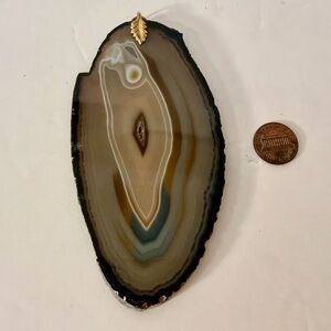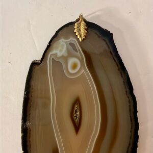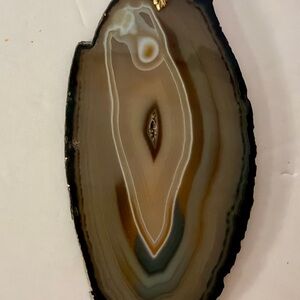 Beautiful agate slice pendant with natural patterns. Features a gold-toned leaf bail for hanging…