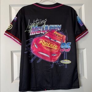 Black button-up shirt with racing-themed patches and pink accents. Features Lightning McQueen from Cars. Customized jersey has red sequined trim. Worn once to Disney. Great condition!! Smoke and pet free home.