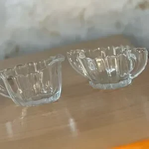 This beautiful crystal sugar bowl and creamer set was produced by Heisey between 1937 and 1957 as part of their Crystolite line. Each piece is oval shaped with an Art Deco “rounded ribbed panel” look that continues onto the handles.