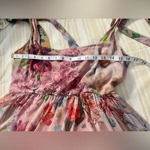 Charming floral midi dress with tiered design. Features vibrant pink and purple tones. Perfect for any occasion. Whimsical shoulder ties.