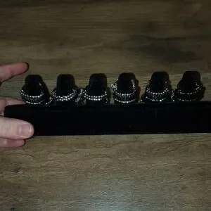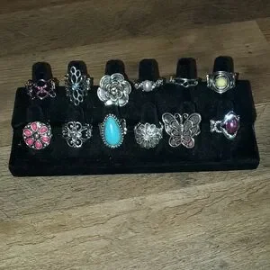 Discover the elegance of this silver and turquoise ring set, perfect for adding a touch of sophistication to any outfit. Rings feature a stretch back fitting sizes 6-11 comfortably. sale includes all 12 rings pictured. #lot5