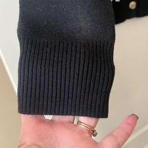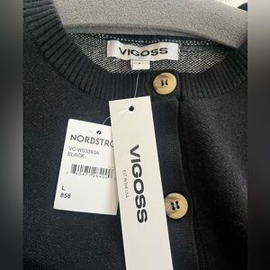 NWT brand new! Elegant black cardigan with tan button details. Ideal for versatile styling. Beautiful white bow detail on bottom. Long sleeve. Rayon, nylon, polyester blend. Measurements in photos. Smoke free home. Vigoss designer. Women’s size Large.