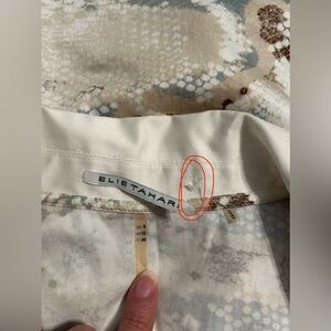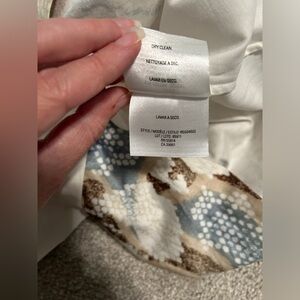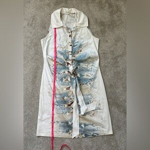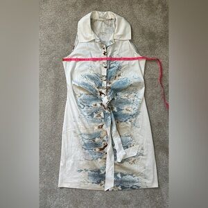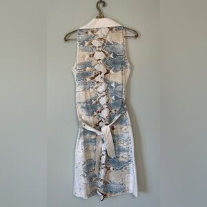 Beautiful Elie Tahari snake-print dress. Features mix of colors- tan, browns, blues on an off white base. Sleek and slim overall with partial buttons and crossed tie integrated detail. Very light fabric and breathable. No signs of stain or error in the fabric.