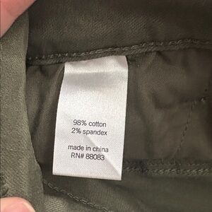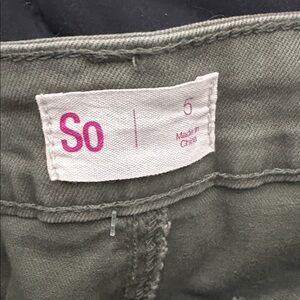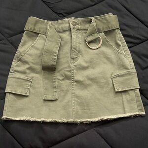 Super cute green denim skirt!! It has pockets and then faux pockets on the side (just a flap that makes them look like cargo pockets). Comes with a belt as well! Size 5 by SO!