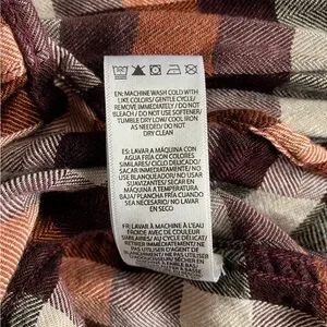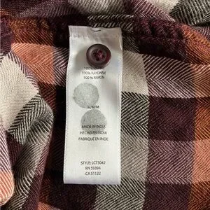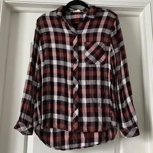 Plaid shirt with a mix of burgundy, orange, and white. Flowy fabric.