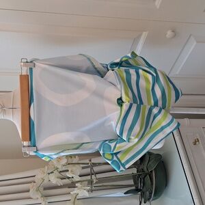 Trending luxury boutique brand Gretchen Scott women's classic bkue/green/white print athletic/casual/preppy/golf/tennis/pickleball stretch 17" skort with elastic waistband, side/back zipper pockets and attached striped print undershorts. Pre-owned and in very gently used condition. Please see pictures