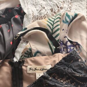 For Love and Lemons three dresses and two rompers one small pink romper one medium tropical floral romper. Three size small dresses. One nude sleeveless dress with black lace overlay and support boning in bodice and adjustable straps. Another with half poof sleeves in black satin with red polka dots, elastic ruching and support bra with straps built in. The last is ivory dress with nude non sheer lining, bell sleeves and crochet details all with zippers in back and in good/excellent condition and no flaws. Priced to sell!!