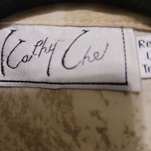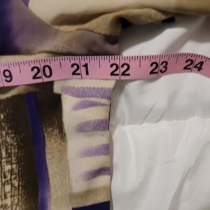 Kathy Che vintage purple, brown, and tan mid sleeved blouse. Stripes and rectangle print. Button down with irredescent buttons. Measurements attached.
