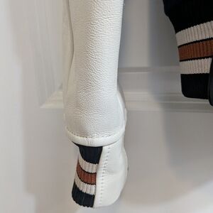 A symbol of team spirit and authentic American cool, the Varsity jacket is an iconic Coach silhouette. It’s crafted in wool with contrasting leather sleeves and pockets, and customized with whimsical patches and signature striped ribbed trim.