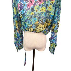 floral wrap blouse, sheer long sleeve, Zara ruffle top, multicolor top, lightweight blouse, colorful wrap shirt, feminine blouse, Moroccan blouse, floral Zara top, wrap tie blouse, sheer floral shirt, stylish women's top, ruffled neckline blouse, delicate, feminine, dainty, girly
