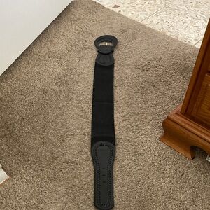 Enhance your wardrobe with this elegant black belt. Its sleek design adds a touch of sophistication to any outfit. Middle part is stretchy