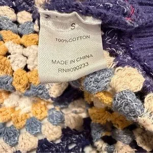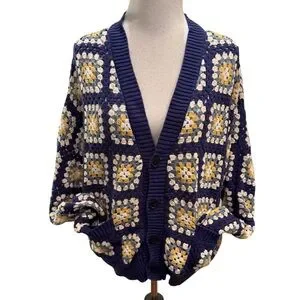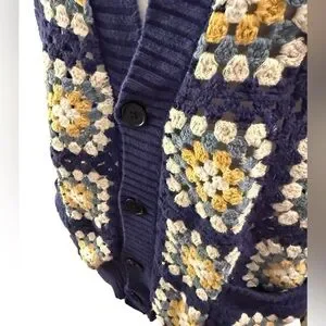 PacSun Estate Cardigan Crochet Granny Square V-Neck Button Down Sweater Navy UNISEX. Boho