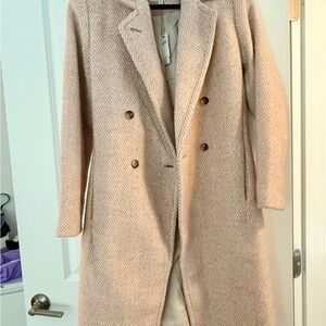 Elegant beige coat with double-breasted design. Features notched collar and long sleeves. Hidden front pockets and straight hem. Fully lined for comfort. A bit oversized, fits more like a small with plenty of room for layering underneath. I’m a typical size 4 and this was oversized on me.