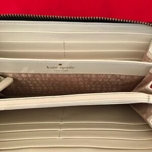 Glossy black PVC with perforated Kate Spade logo design. Zip around closure secures main compartment; Back slip pocket. Inside leather trim & signature lining; 2 bill compartments, inside zipper coin compartment, 12 credit card slots. Kate Spade plaque on front. Perfect for work or school, roomy wallet will keep you organized. NWOT
