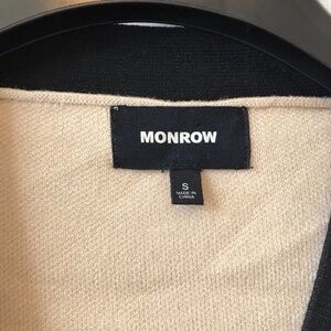 The Monrow Colorblocked V-Neck Cardigan in size Small is a stylish and versatile sweater for women. Crafted with a classic V-neck design, this cream-colored cardigan is perfect for adding a touch of sophistication to any outfit. Made by the brand Monrow, known for their trendy and high-quality clothing, this cardigan is sure to become a staple piece in your wardrobe. Ideal for layering over your favorite tops, this cardigan is a must-have for any fashion-forward woman.