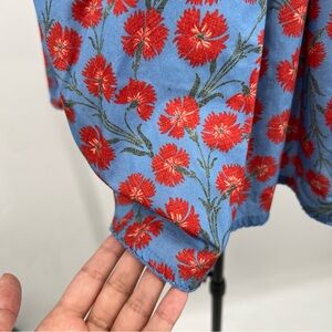 Stunning Agua by Agua Bendita dress featuring the brand’s signature bold floral print and vibrant colors. This eye-catching piece showcases a blue background with red floral pattern, dramatic puff sleeves, and a flattering waist cutout with gathered detailing that creates a feminine, cinched silhouette. Lightweight and playful, this dress is perfect for warm weather, vacations, and statement outings.