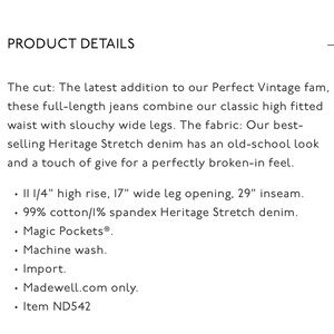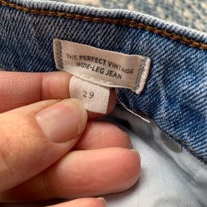 Wide leg perfect vintage jeans in Elmont wash. Good condition - small hole at back right pocket as picture. Size 29. Non-smoker.