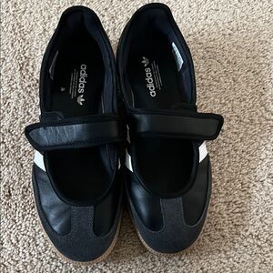 Classic Adidas Samba Jane sneakers with a black and white design. Velcro strap for easy wear. Women’s sz 8, great condition, only worn a few times.