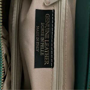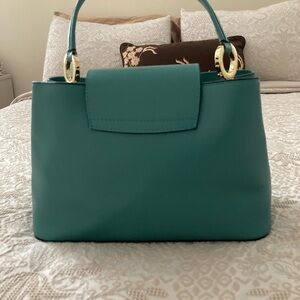 Stylish teal leather satchel. Features elegant gold accents. Ideal for versatile use.like New medium size no marks,no pets.