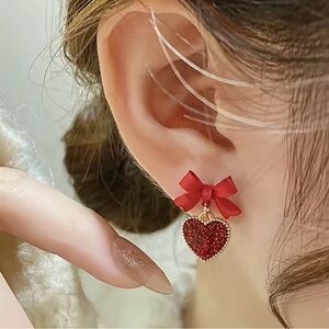 Add a touch of romance with these elegant red heart earrings, featuring a charming bow design. Perfect for any occasion.