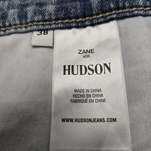 The Hudson Zane Skinny Jeans in size 38 (Measures 40 x 32) offer a stylish and comfortable option for men looking for a retro city-inspired look. These stonewash stretch jeans feature a low rise with a zip and button closure, a 5-pocket design, and a solid blue color made of a blend of spandex and cotton denim. The skinny fit and stretch material make them suitable for all seasons, while the biker and USA-themed accents add a touch of personality to the overall design. Machine washable for easy care, these jeans are a versatile choice for any casual or trendy outfit.