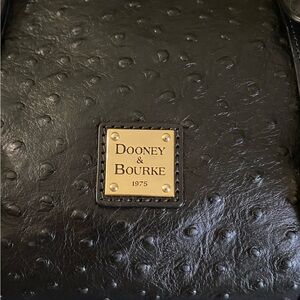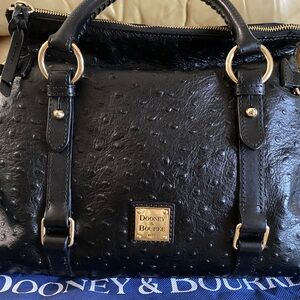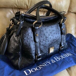 Authentic Dooney & Bourke Large satchel in Black ostrich-embossed leather with whipstitch handles and tassels. Exterior and hardware look fantastic. Inside lining shows light use. Original strap is missing so I included a new vegan non-branded one. Bag is stuffed for pics. Smoke free home. Approx size 15x10x7 at widest points.