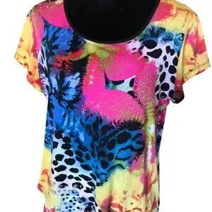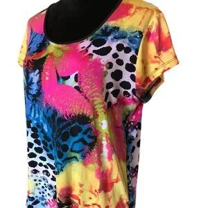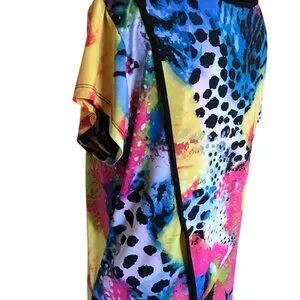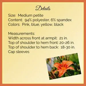 Lightweight summer top in a faux partial wrap style with uneven hems and cap sleeves, size medium petite, in very good condition. Very soft, bright, and colorful!