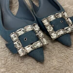 Cute Y2k Style Blue Kitten Slingback Heels with Crystal Buckle Embellishment