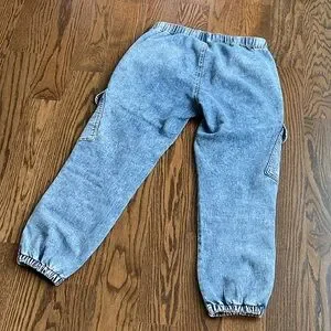 Stylish blue cargo jeans. Features elastic waistband and cuffs. Multiple pockets for convenience. 69% cotton, 30% polyester, 1% spandex. Good pre-owned condition.