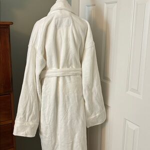 Luxurious plush bathrobe in white. Features a cozy belt and pockets.