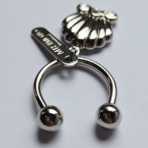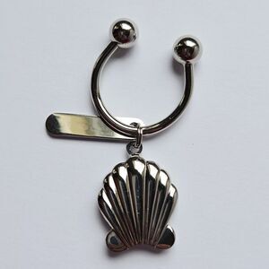 Pre-owned, in beautiful condition. Has a few faint scratches here and there, but otherwise in excellent condition. Real pearl embedded in the center of the shell. This is from Japan. The horseshoe ring unscrews on one end so you can slide your keys on the barbell. Measures approximately 2.5" long.