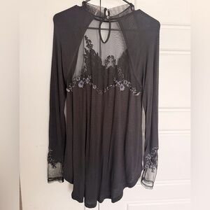 Chic black blouse with sheer neckline. Features floral embroidery. Perfect for versatile styling.