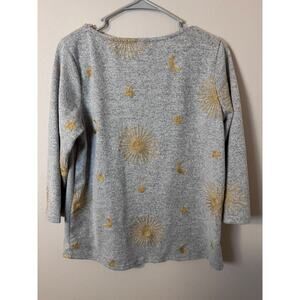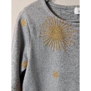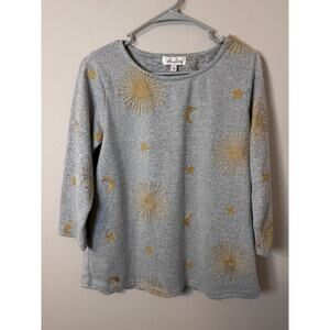 Amelioré women’s Celestial embroidered top in gray, size Medium. Features delicate gold celestial embroidery for a unique, elevated look. Chic, artsy, and versatile.