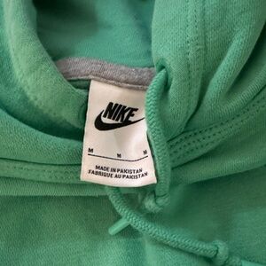 Nike mint green hoodie in size medium. In excellent condition, no flaws. Minor stain in middle. No holes. Pet free and smoke free home. Nike logo in perfect condition. Features front pocket.
