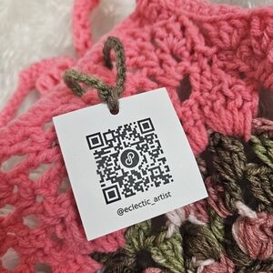 This unique crochet top begins with a circular centerpiece worked in earthy camouflage-inspired tones of green, olive, tan, blush, and cream. The soft pink and green color palette blends traditional camo hues with a feminine touch, creating a bold yet delicate balance.