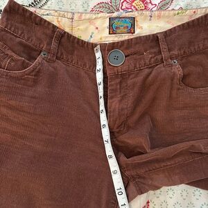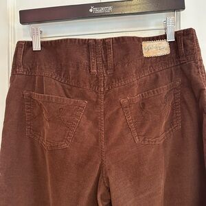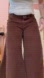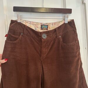 Carefree brown wide-leg corduroy pants. Low slung, sit on hips. Yards of fabric gives these the most flowing, swishy style. Super soft corduroy in a fine wale. Warm brown. Great styled simple, w a fitted and/or cropped top. Wide belt loops accommodate a nice bulky western belt, if you like. Shown on my 4/6 frame, fit like a 6 on me.