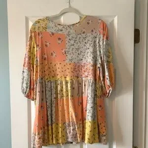 Stylish floral patchwork tunic with 3/4 sleeves. Features a blend of orange, yellow, and cream colors. Pet friendly and smoke-free home.