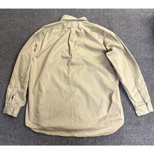 The product is a vintage Polo Ralph Lauren Men’s XL Khaki Blaire 100% Cotton Button Up shirt with a red pony logo. It features a solid beige color, long sleeves, a collared neckline, and button closure. The shirt is part of the Ralph Lauren Blaire product line, perfect for casual, business, or travel occasions. Made of woven cotton fabric, this classic and retro-themed shirt is a timeless addition to any man's wardrobe.