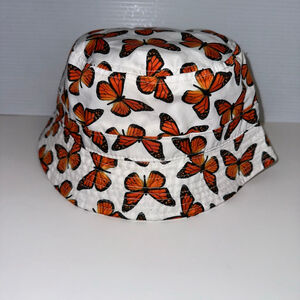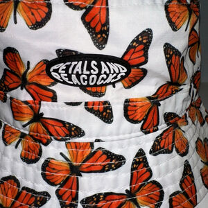 This is a pre-owned bucket hat by Petals and Peacocks. The hat is white and covered in a monarch butterfly print. The brand's logo is displayed on the front. The hat is made of 100% polyester. The hat is one size. There are no visible imperfections.