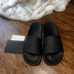 Elegant Gucci slides with embossed logo. Sleek and stylish design. Worn less than 5 times basically still new. Size 8 comes with original precept when I purchased in 2019.