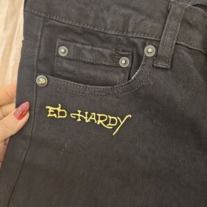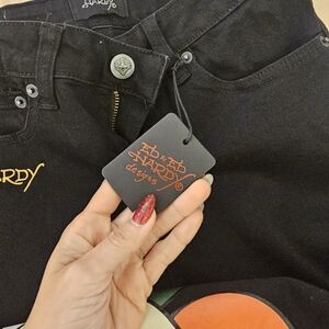 2 items Ed Hardy black jeans low rise with bold graphic design. Features skull and heart motif. Scarf can use like a top. Both new with tags.