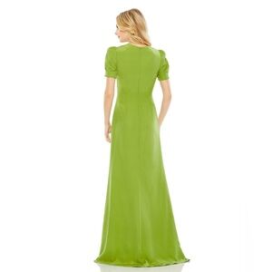 Keywords: mac duggal gown, embellished evening gown, puff sleeve gown, formal gown, pageant dress, gala gown, prom dress, luxury formalwear, statement gown, black tie dress, wedding guest gown, apple green dress, red carpet gown, couture gown, designer evening dress, dramatic sleeves, showstopper dress, NWT designer gown