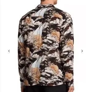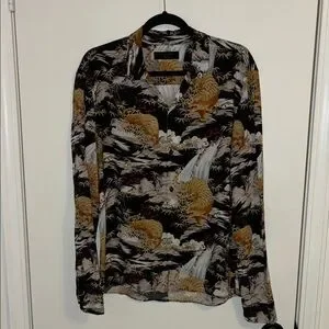 Make a bold statement with this striking AllSaints long sleeve button-down shirt featuring an Asian-inspired tiger print. Known for their edgy, modern aesthetic, AllSaints delivers standout style with this slim-fit piece. Perfect for elevating a casual look or adding personality to a night-out outfit.
