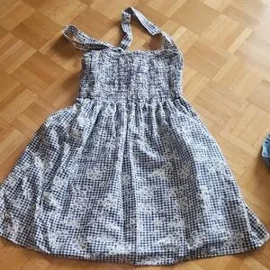 Charming womens dress featuring a blue and white checkered pattern. Perfect for any occasion, offering both style and comfort.